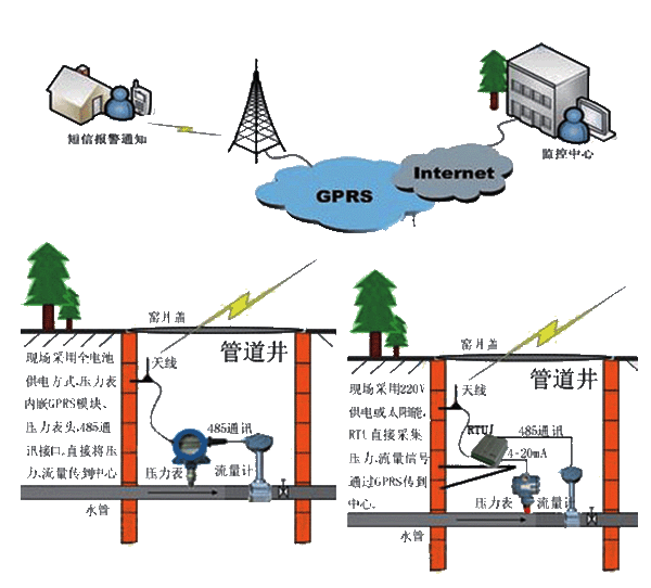一、系統(tǒng)簡(jiǎn)介 為保證供水工作的科學(xué)性,依靠現(xiàn)代計(jì)算機(jī)通信技術(shù)和傳感技術(shù),實(shí)施對(duì)供水管道的無(wú)人化遠(yuǎn)程實(shí)時(shí)監(jiān)測(cè),并且能夠自動(dòng)傳輸?shù)缴厦娓骷?jí)主管部門(mén),監(jiān)測(cè)輸水管道、城市供水管道的壓力、流量信息;及時(shí)發(fā)現(xiàn)管網(wǎng)故障,提高維護(hù)效率、降低損失,保障輸水、供水質(zhì)量,達(dá)到科學(xué)預(yù)警,減少成本,提高效率的目的。 二、系統(tǒng)組成 v 監(jiān)控中心:中心服務(wù)器、外網(wǎng)固定IP、管網(wǎng)系統(tǒng)軟件; v 通信網(wǎng)絡(luò):基于移動(dòng)GPRS或者電信CDMA的通信網(wǎng)絡(luò)平臺(tái); v 采集終端:無(wú)線(xiàn)壓力表/低功耗遙測(cè)終端BTU; v 測(cè)量?jī)x表:流量計(jì)/脈沖水表、壓力變送器、報(bào)警設(shè)備等; v 供電方式:電池供電、太陽(yáng)能供電、市電。