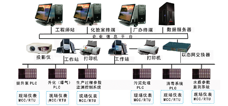 城市污水處理廠自動(dòng)控制系統(tǒng)采用計(jì)算機(jī)十PLC+現(xiàn)場(chǎng)儀表構(gòu)成的分布式控制系統(tǒng)。系統(tǒng)設(shè)置一個(gè)中央控制室PLC站和現(xiàn)場(chǎng)PLC控制站,分為管理層(中控室操作員站)、控制層(PLC控制站)和執(zhí)行層(現(xiàn)場(chǎng)測(cè)量?jī)x表、執(zhí)行機(jī)構(gòu))。中央控制室與現(xiàn)場(chǎng)控制站之間通過(guò)工業(yè)以太網(wǎng)(或工業(yè)總線)形式通訊。